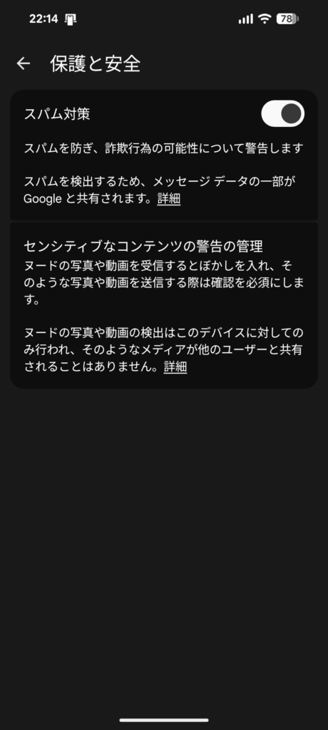 1. 画面内の「スパム対策」のスイッチをタップして「オン(色付き)」にします。 ※これでGoogleが怪しい詐欺メッセージや危険なURLを検知して、自動で警告・ブロックしてくれます。