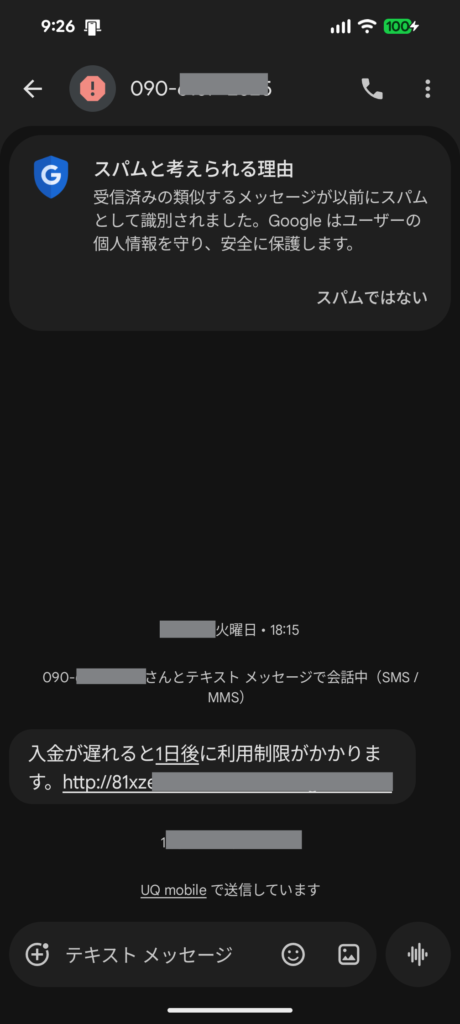 しかし、この設定をしていないスマホには、通常のメッセージとして「入金が遅れると〜」とURL付きで普通に届いてしまい、パニックになってしまう方が続出しています。